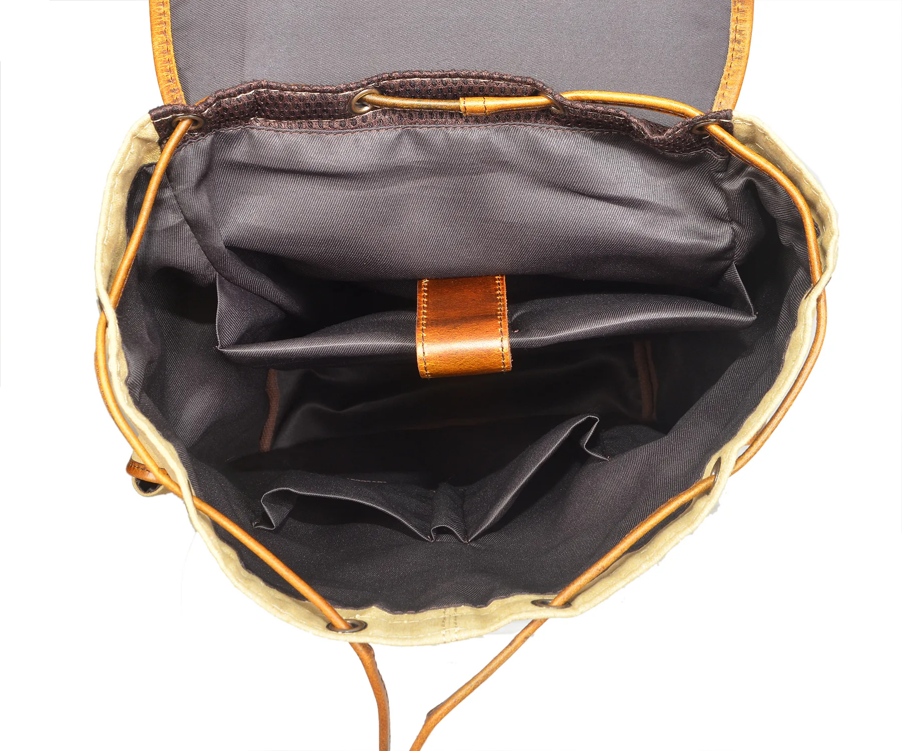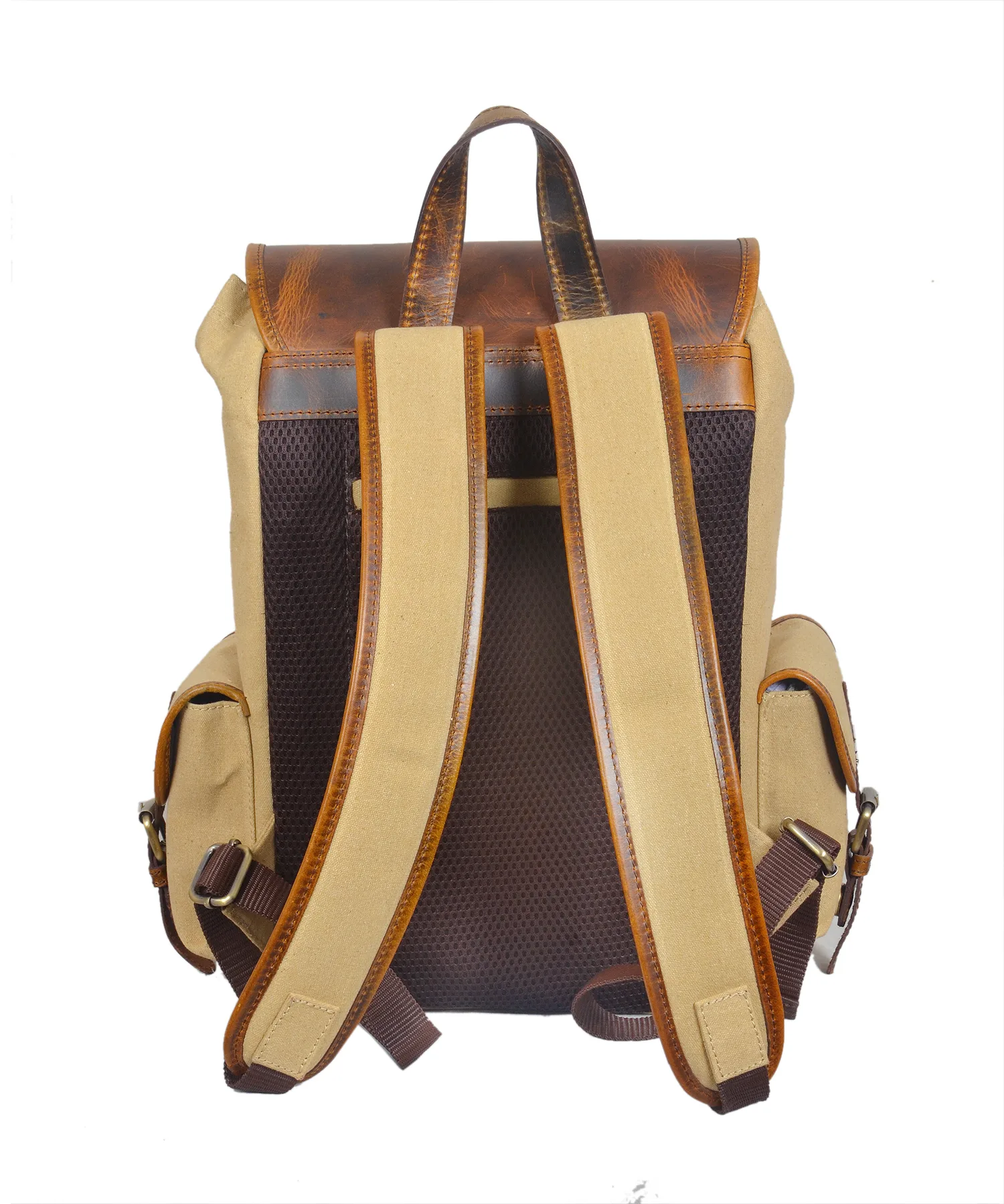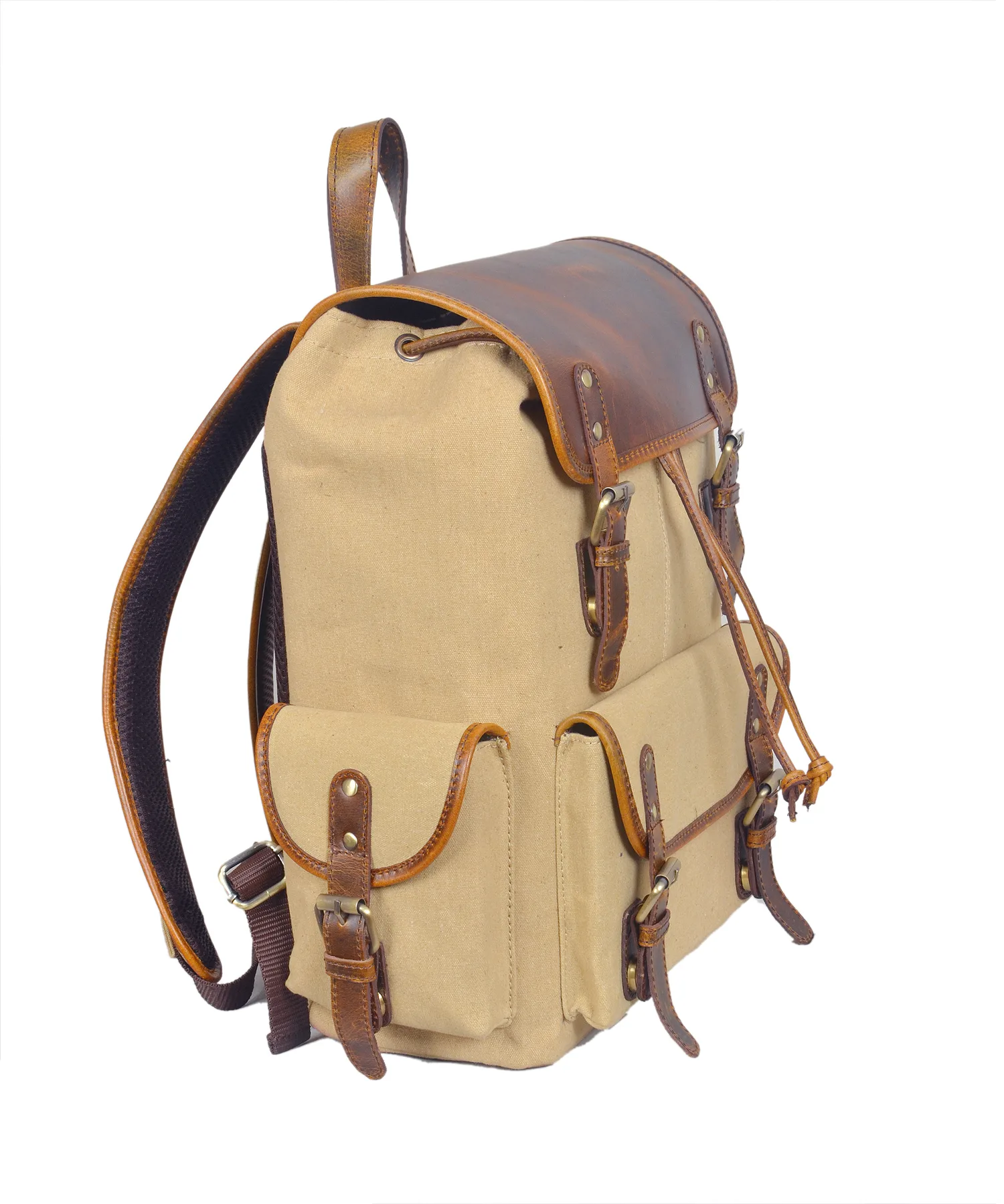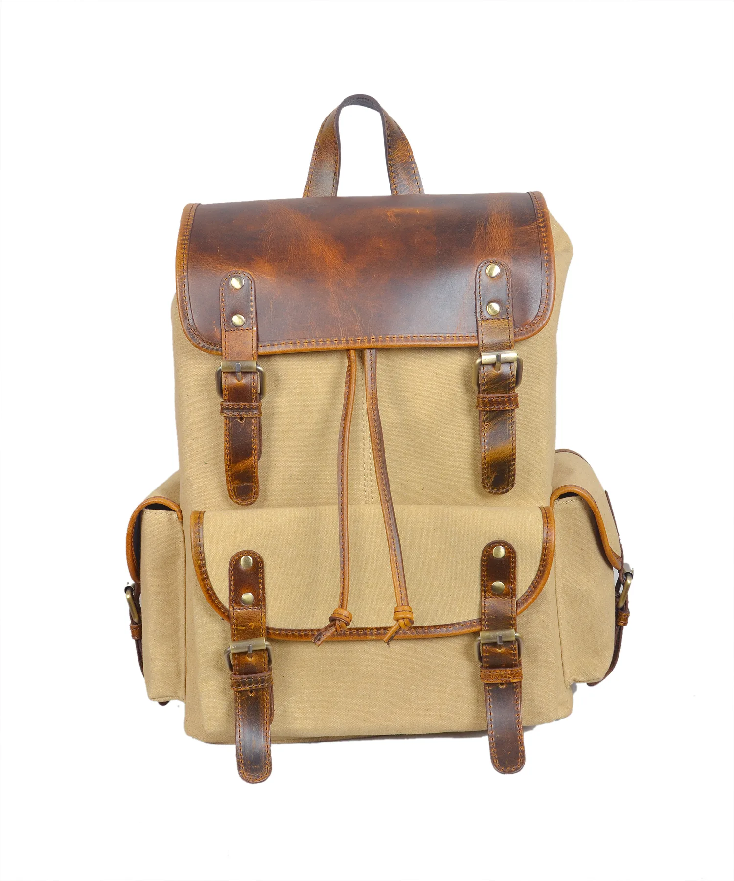 The Volere canvas and leather backpack is your ideal companion for everyday adventures, office commutes, college, or weekend getaways. Crafted with premium beige canvas and genuine brown leather, this backpack offers a refined vintage look while being incredibly durable and functional.