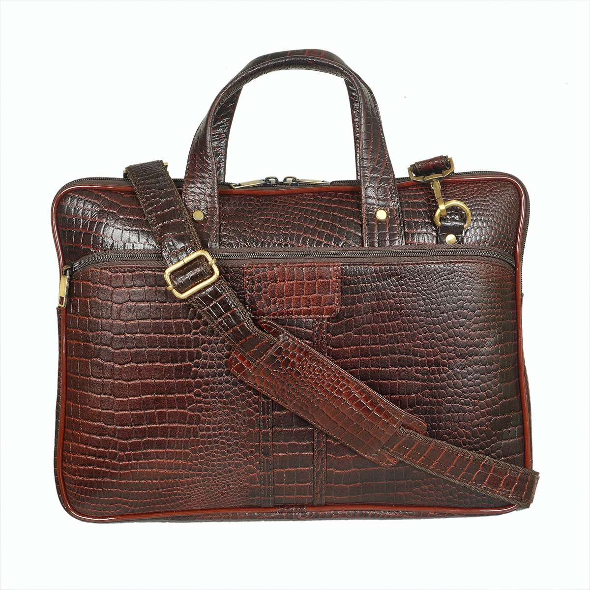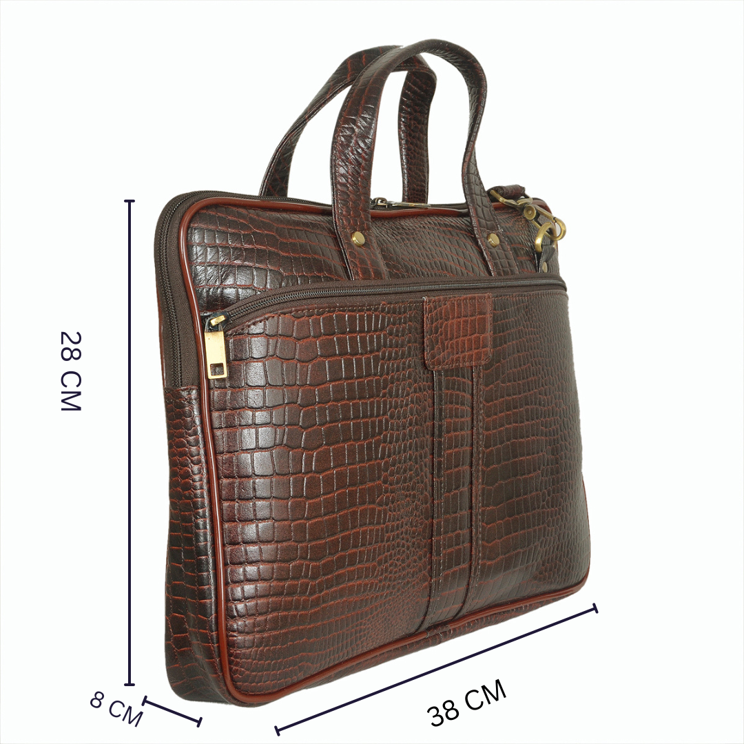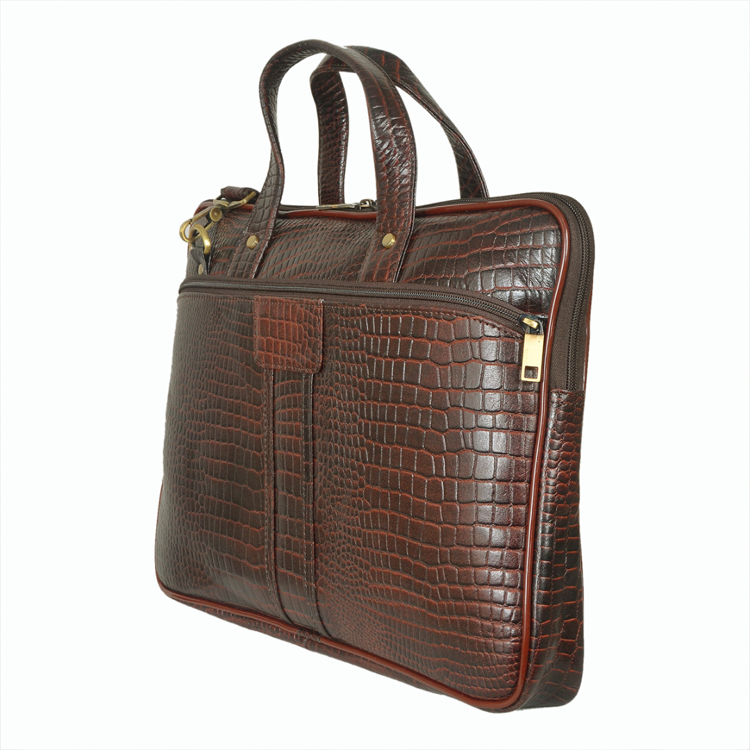 Elevate your professional appearance with this sophisticated laptop bag crafted in luxurious brown leather featuring an elegant crocodile pattern. This versatile business briefcase combines style with functionality, offering ample space for your laptop and essential documents. The bag showcases premium craftsmanship with its detailed embossing, brass-tone hardware, and multiple compartments for organised storage. The adjustable shoulder strap provides comfortable carrying options, while the sturdy handles offer a classic briefcase grip. Perfect for executives and professionals, this bag seamlessly transitions from boardroom meetings to business travels. The rich brown colour and textured leather finish create a distinguished look that commands attention. Multiple zippered compartments ensure your belongings stay secure and easily accessible. The durable construction and high-quality materials ensure this bag maintains its sophisticated appearance while protecting your valuable electronics and documents.