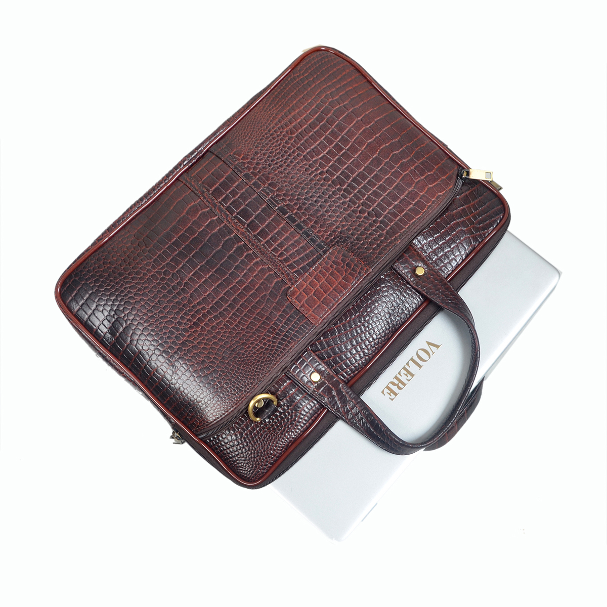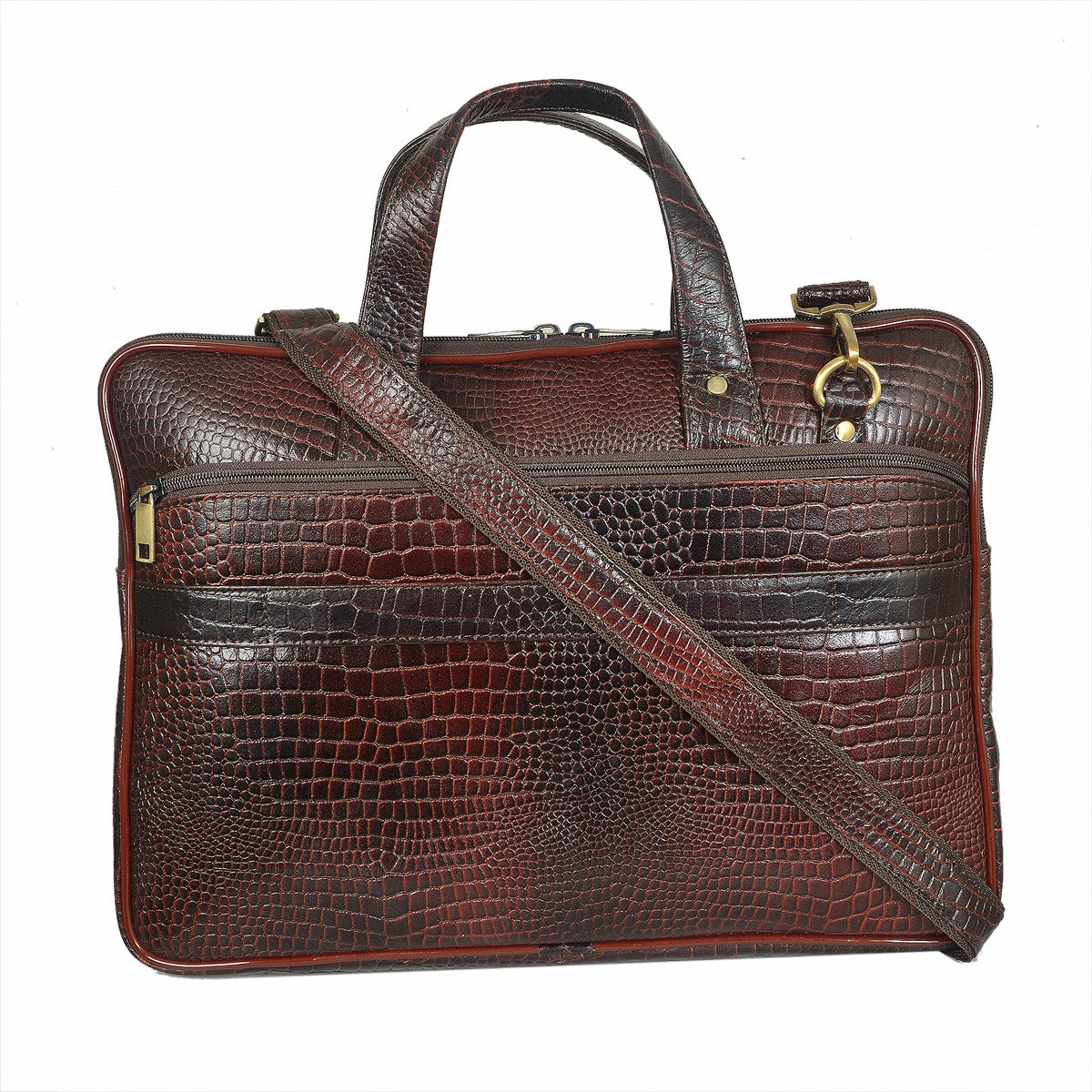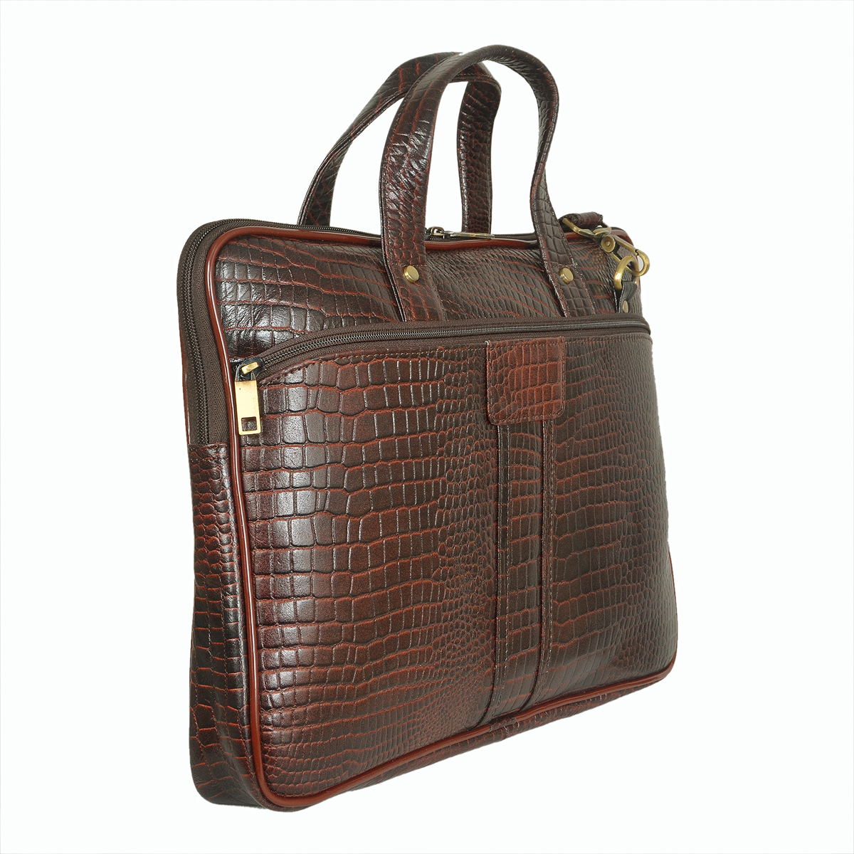 Elevate your professional appearance with this sophisticated laptop bag crafted in luxurious brown leather featuring an elegant crocodile pattern. This versatile business briefcase combines style with functionality, offering ample space for your laptop and essential documents. The bag showcases premium craftsmanship with its detailed embossing, brass-tone hardware, and multiple compartments for organised storage. The adjustable shoulder strap provides comfortable carrying options, while the sturdy handles offer a classic briefcase grip. Perfect for executives and professionals, this bag seamlessly transitions from boardroom meetings to business travels. The rich brown colour and textured leather finish create a distinguished look that commands attention. Multiple zippered compartments ensure your belongings stay secure and easily accessible. The durable construction and high-quality materials ensure this bag maintains its sophisticated appearance while protecting your valuable electronics and documents.